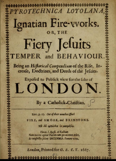 Een jaar na de Grote Brand verscheen het uitgebreide, eerder delirisch pamflet Pyrotechnica Loyolana geschreven door een anonieme “Catholick-Christian”. De ondertitel, of korte inhoud zo u wil, luidde “Ignatiaans vuurwerk, of het vurige temperament en gedrag van de jezuïeten. Een historisch overzicht van de opkomst, de groei, de doctrines en de daden van de jezuïeten. Blootgelegd voor het publiek in het belang van (de gebeurtenissen) in Londen.” Het boek beschrijft al het kwaad dat de militante Sociëteit van Jezus berokkend heeft sinds hun stichting.